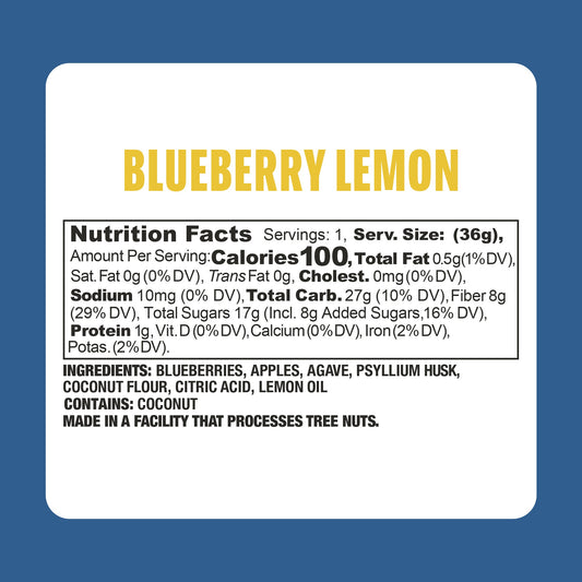 Blueberries, Apples, Agave, Psyllium Husk, Coconut Flour, Citric Acid, Lemon Oil